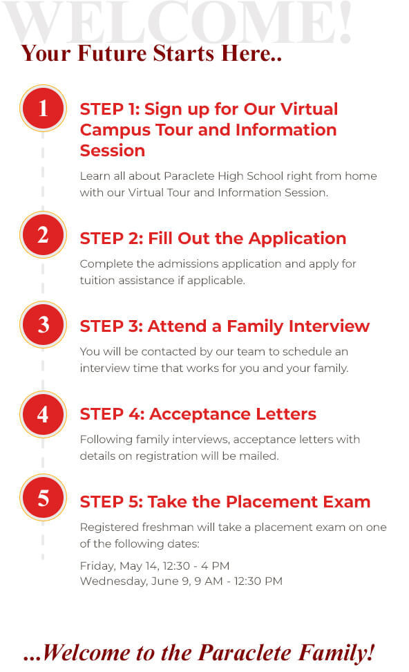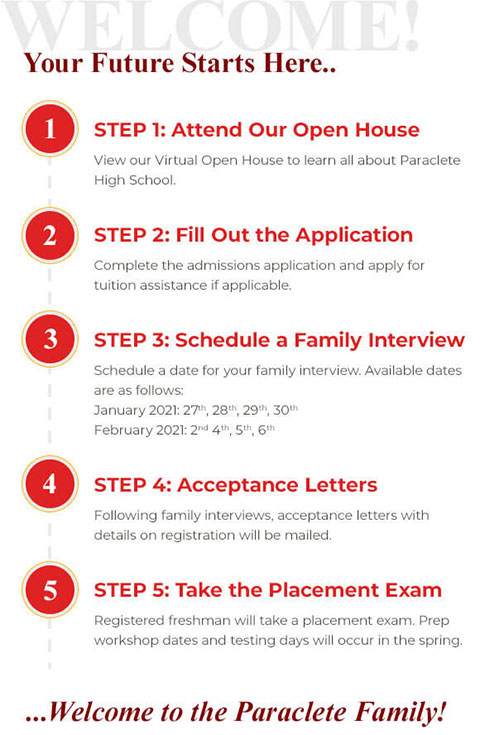 At Paraclete High School, we are dedicated to preparing students to be successful in any future they may choose. To learn more about our application process, click on the button below.